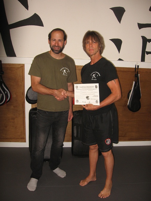 He is has achieved the rank of Shifan Yee Duan under Grandmaster Dr. Henry Cook (Seven Winds Wing Chun KungFu), Nidan (2nd DAN) in Ryukyu Kempo under Grandmaster Jack Hogan (Hogan Karate International), Certified Instructor in Modern Arnis under Grandmaster Bruce Chiu (Arnis International), and most recently successfully completed the necessary requirements to become a IKI Certified Apprentice Instructor in Krav Maga.