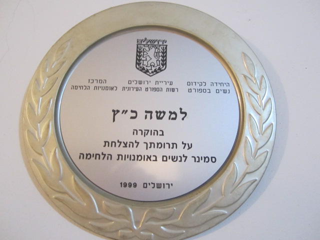 Jerusalem municipality, martial arts center, award for the promotion of self defense for women, 1999. A leader in the movement for women in martial arts and one of the promoters of the first ever martial arts seminar for women.