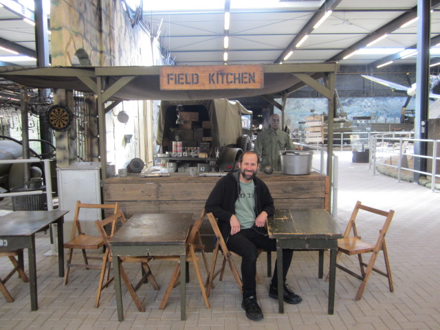 Moshe at the field Kitchen. Original tables and tools. The man behind the counter is not real, so no coffee was served. (Thankfully there was a place to have coffee nearby)