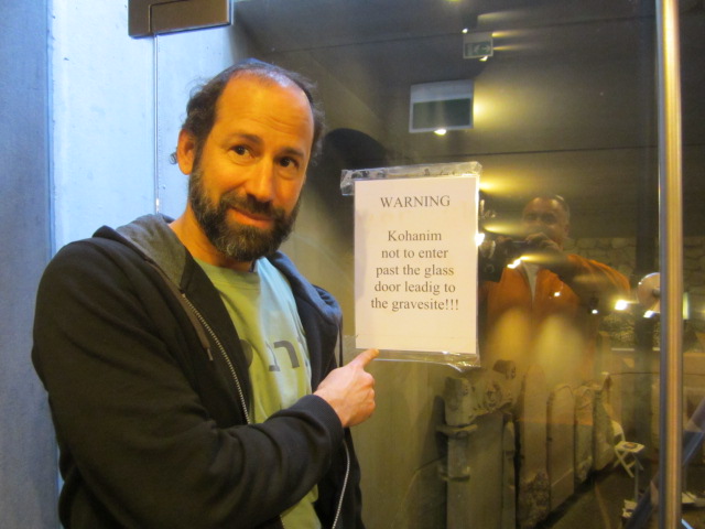 Sign indicating that this is as far as a cohen (one descended from Aaron the brother of Moses) can go. So this is where I stop. It reads; "WARNING Kohanim not to enter past the glass door leading to the grave site"