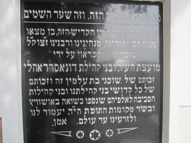 The merit of those who dwell in this "house of the eternal"(cemetery) and the merit of all our holy martyrs of our community and the members of the nearby communities in their thousands who were taken in the Holocaust in Auschwitz and the other hell holes, will stand for us and our seed for ever. Amen.