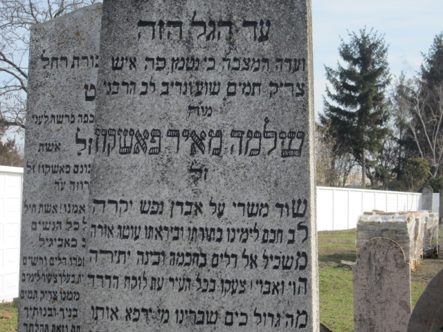 The grave of a community member, Eliezer Yom Tov Grunwald. He survived the camps and lived to a ripe old age, but other family members did not. On his tombstone are remembered those family members who were murdered and never buried, including two daughters, Golda and Mara, a son Mordechai, mother in law Esther and her daughter Zartel, of blessed memory.