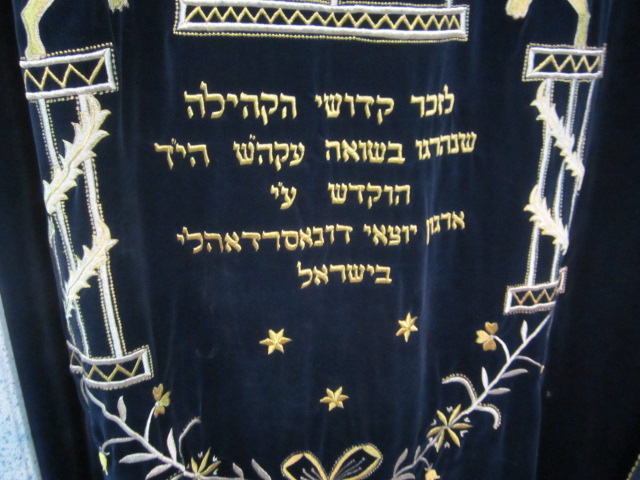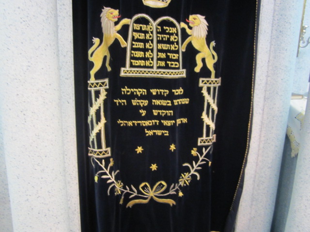 The Parocheth, the cloth covering that covers the ark where the Torah scrolls are kept. On top are the 2 tablets with the ten commandants. On the bottom of the parocheth, as you can see in the second photo, is the dedication; "In memory of the holy martyrs of the community, who were killed during the Holocaust, giving their lives to sanctify the name of God, may God avenge their blood. Dedicated for this holy purpose by the Association of expatriates of Dunaszerdahely in Israel."