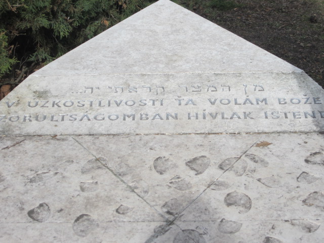 The bottom part of the memorial contains words from the Torah, "From the depths I cry out to you", and there are footsteps, many footsteps but they go in one direction only, symbolizing the thousands of Jews who were taken from here. They went in one direction and never came back.