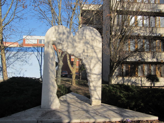 The memorial shows the two tablets of the ten commandments that Moshe/Moses brought down from Mount Sinai. But it is torn, with a huge hole running through it, symbolizing that the heart of the Jewish people was torn out and very little remains. Next to it are original stones, laying there as they did when it was destroyed, like the Holy Temple of Jerusalem, a sign of the destruction. Destruction that is permanent, a house destroyed that will not be rebuilt.