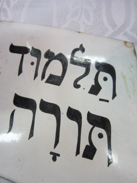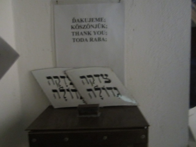 This sign survives from the original pre-war synagogue. It says "Talmud Torah" which means "The Study of the Torah, the Bible" and it indicates that this is where one would leave a donation intended for the upkeep of Torah studies.
