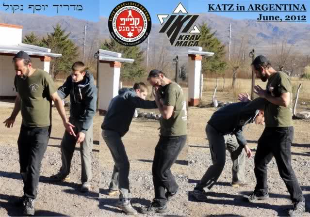 The exact tools and combination you use will be determined by the circumstances and by your own personal martial arts background. If before coming to Krav you trained in Muay Thai then you might naturally resort to an elbow strike to the face. If you have a Judo background you might resort to O Soto Garei