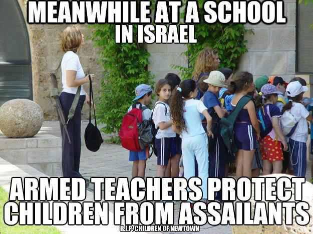 "Rhiannon, that’s such a powerful photo on several levels. I am a supporter of Israel and the IDF. This teacher has probably had over two years of intense training and military service involving the use of that weapon. She may also be an off-duty reservist, and encouraged to carry her service weapon while off-duty. Israeli teachers are permitted to have guns to protect their students because terrorists have on occasion attacked groups of schoolchildren. But Israel is a very different society than ours and has a very different attitude and perception about firearms, one that is more respectful of and responsible to guns as necessary tools in their everyday lives to protect them from even greater, more wide-spread harms.
